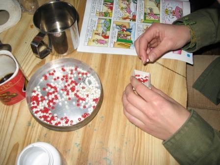 Na Vagóně jsme pak soupeřili v navlékání korálků a přišívání knoflíku druhou rukou.