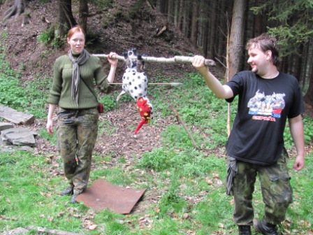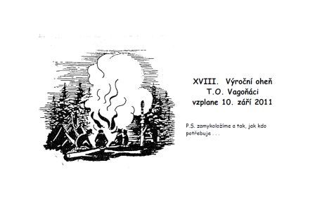 Letos to na mykoložení moc nebylo. Hub bylo po skrovnu, i tak jsme něco našli. Počasí vyšlo, kupodivu bylo teplo. Soutěžíme ve stavbě schodů a ve slalomu na chůdách. Před zapalováním ohně, tvoříme pomocí křupek názvy věcí, písní a pohádek. Když přijel Honza, zapálili jsme výroční oheň. Ve tmě jsme hráli schovku a pak na sardinky. V okolí Vagónu bylo slyšet syčení a někde v koutku se krčila kupa tiše se smějících lidiček. Poté u ohně Michal celou dobu přemýšlel, kam napatlat svítící směs. Nakonec měl nejvíce popatlané ruce. V neděli ráno dal Brčál dětem důvěru a posadil na zadáka Marečka, na háčka Puštíka a sám dělal porcelán.