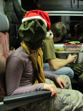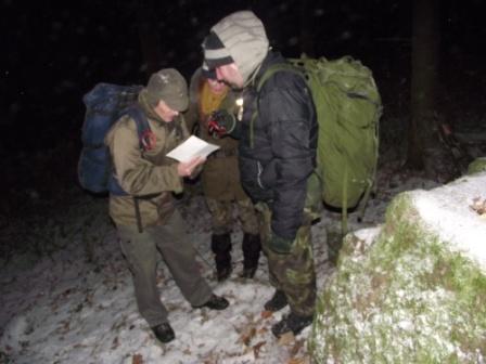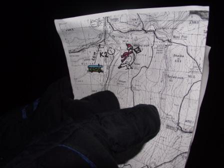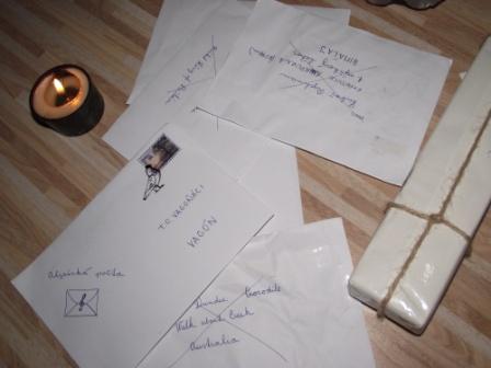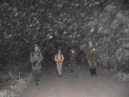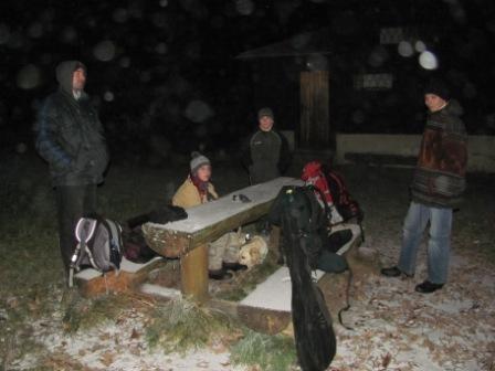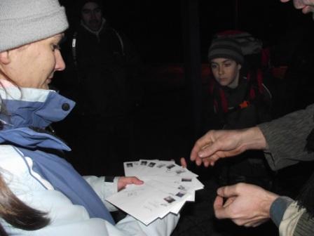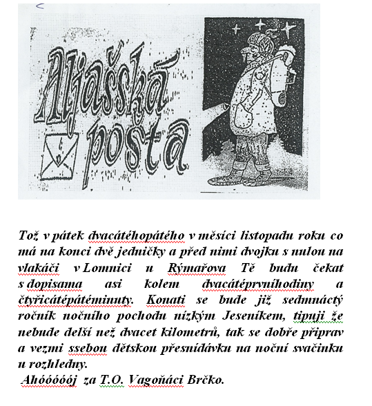 Ve Valšově nastupujeme na zpožděný vlak, ve kterém už cestují ostatní pošťáci. Vystupujeme v Lomnici něco po desáté hodině a vydáváme se na dalekou pouť přes K1 a K2 k Vagónu. Na cestu dostáváme mapu, dopisy nebo balíčky a světýlka, ať je nás pořádně vidět. Mrzne a jemně sněží. Jdeme víceméně společně, ale po svačince, se vytvoří skupinky a na Roudný se couráme postupně. K1 je pod nejnižším rohem Čertova kamene. První pošťáci jsou zde kolem jedné hodiny, ostatní mají zpoždění tak deset minut. My, co jsme četli zvadlo a řídíme se jím, svačíme přesnídávku. Ke K2, která je u mostu přes trať, vede spousta cest. Nejkratší a nejrychlejší se ukáže ta přímo přes hřeben. Tudy šli Brčko, Koza, Peťa, Osel, Kokos a Fany. Na K2 jsou v 3.53. První z nich přiběhne k Vagonu Koza. Po první skupině docházejí postupně Vydra s Verlibou a Ruprecht s Čertem a s Lumpem. Pak Fata Morgana a Michal, dále Kečup, Sranda a Martina, ti však K2-kou neprošli.