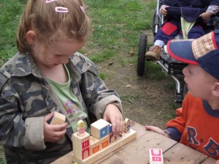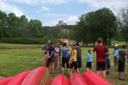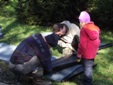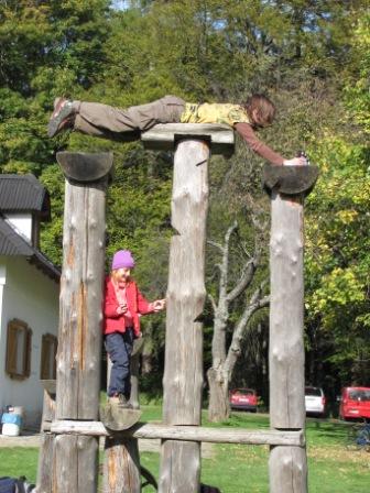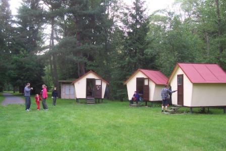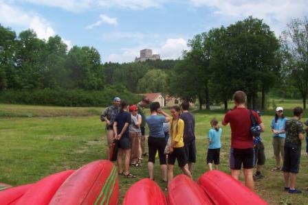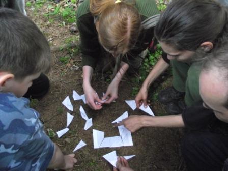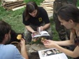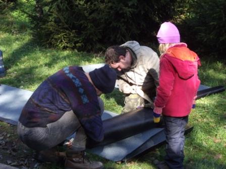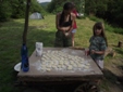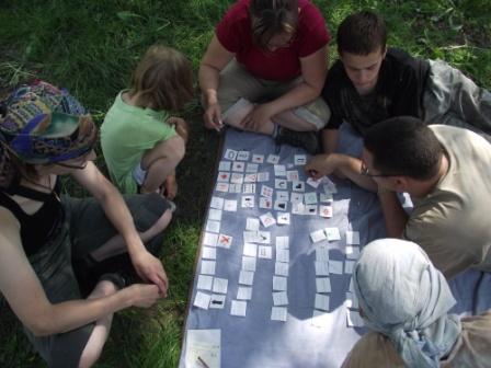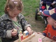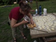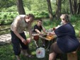 Po obědě po skupinkách určujeme mapové značky a pak v lese pomocí značek, tentokráte pochodových, hledáme obrázky různých zvířátek a rostlinek. Pak ve Vagonu skládáme puzzle s historickými postavičkami. Brčál nám dělá koblížky. Celý den je krásně, svítí slunce a my snad pořád jen sedíme a jíme.