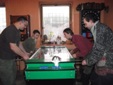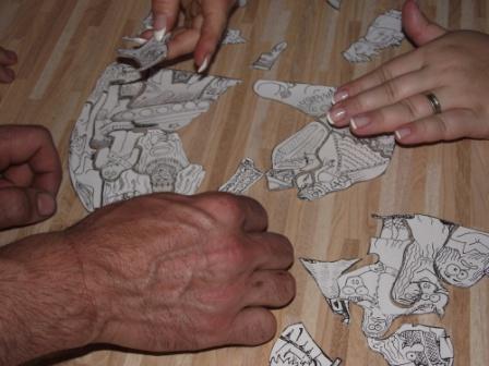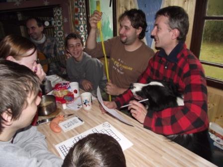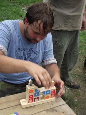 Večer testujem kapacitu chatičky. Jsme tam skoro všichni. Hrajeme hru na hádání pexes a mezitím zkoušíme trpělivost ve dřevěné hře Bludiště s dírami.