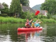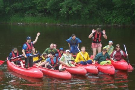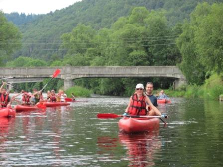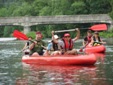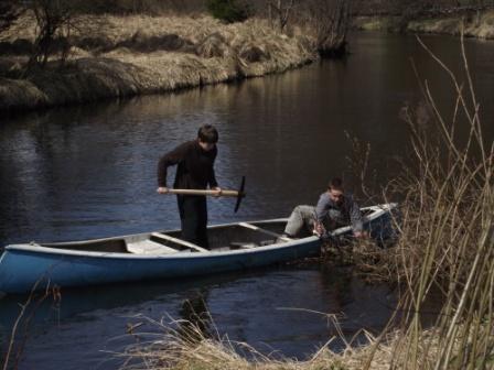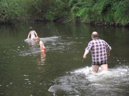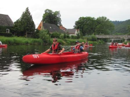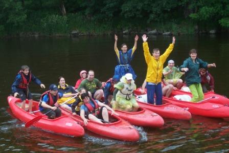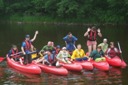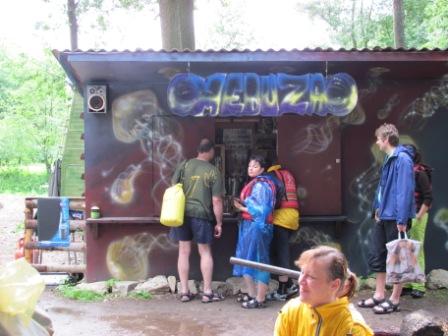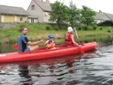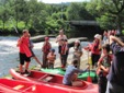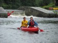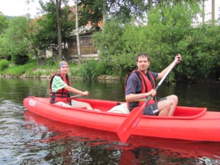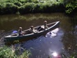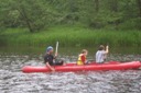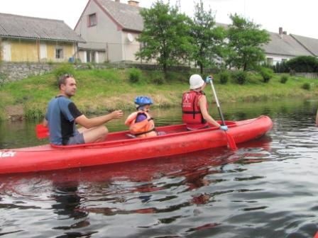 V neděli vyjíždíme z Velkých Hydčic. Prší. Řeka je prázdnější než včera. Po první sjezdu si vynutíme přestávku na kafe. Honza chtě nechtě musí souhlasit. Pak už jedeme ukázněně a skáčeme či jedeme všechny jezy, jak nám Honza přikáže. Aneta nám zabavuje tenisák, s kterým si hrajeme na hoňku. Oteplí se a je krásně. Do cíle naší cesty dojíždí někteří úplně mokří, neboť jsou hozeni do řeky.