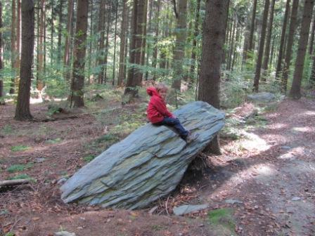 Pak jdeme provětrat draky na pole nad Ferdinandovem a zkoumáme bývalý lom. Po cestě na Velký Roudný se stavíme podívat na zámek v Janovicích. Na Velký Roudný už vyleze jen hrstka z nás. Jdeme tam schovat K1 na Aljašskou poštu.